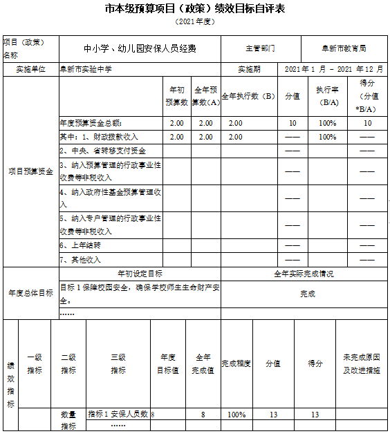 (3)“中小学、幼儿园安保人员经费”项目自评综述:根据年初设定的绩效目标,项目自评得分100分。项目全年预算数为2万元,执行数为2万元,完成预算的100%。项目绩效目标完成情况:一是预算资金执行率100%,得分10分;二是各预算绩效目标全部完成,完成程度均为100%,得分90分。中小学、幼儿园安保人员经费项目全部达成预期指标,完成程度100%,该项目绩效自评总分100分。发现的主要问题及原因:一是无。下一步改进措施:一是无。