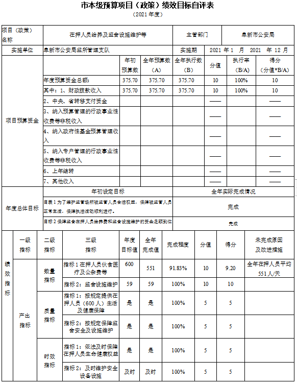 (1)“在押人员给养费”项目自评综述:根据年初设定的绩效目标,项目自评得分98.57分。项目全年预算数为375.70万元,执行数为375.70万元,完成预算的100%。项目绩效目标完成情况:一是维护监管场所被监管人员合法权益,保障被监管人员正常生活,保障执法活动顺利进行;二是监舍在押人员给养费和监舍设施维护的资金足额到位。发现的主要问题及原因:无。下一步改进措施:无。